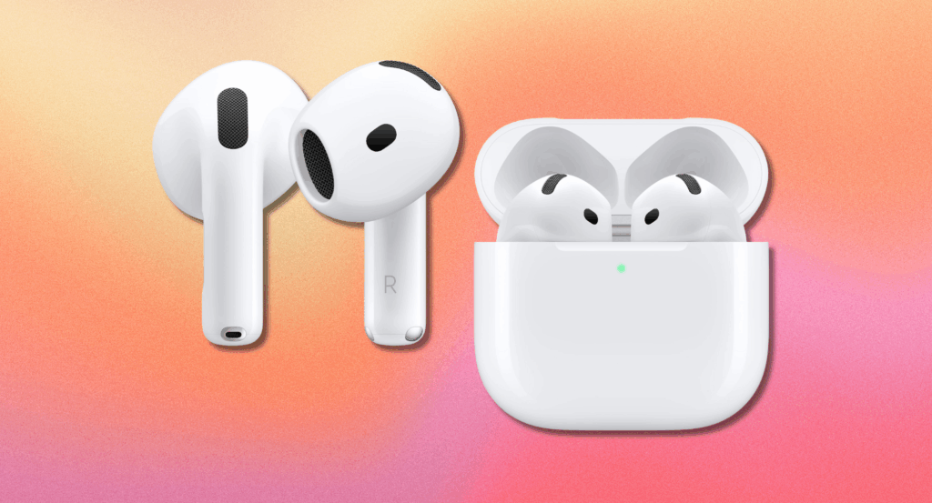 Apple Airpods 4 against a colorful pink and orange background.