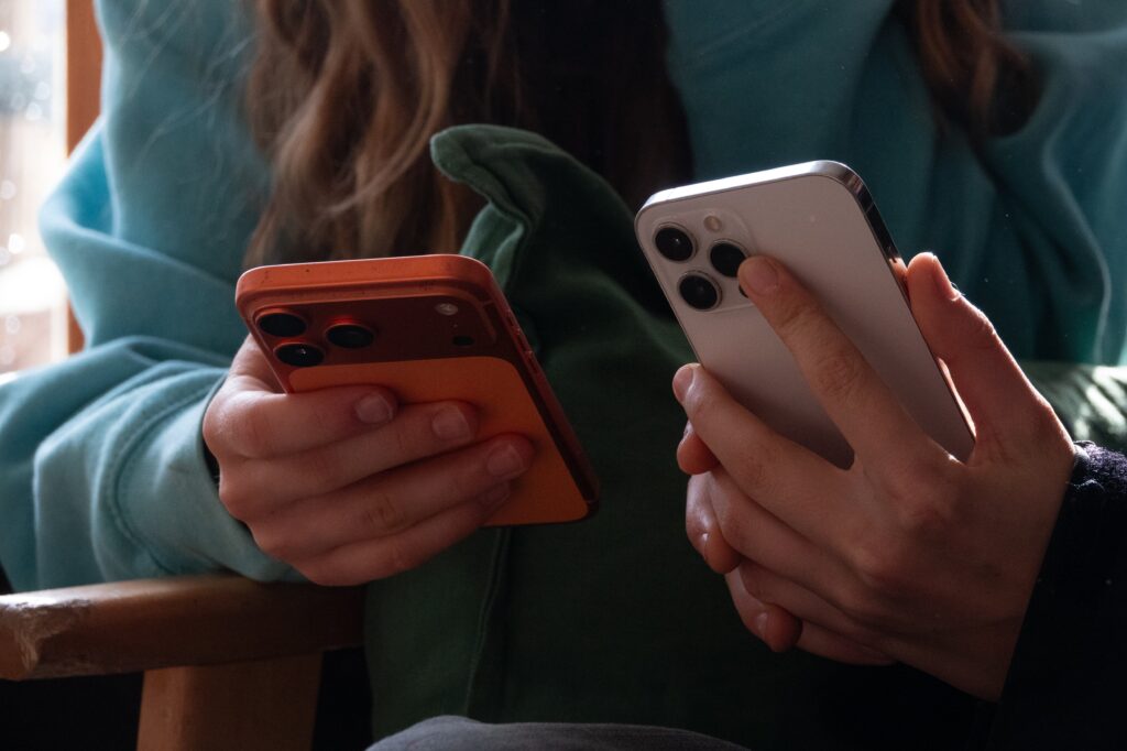 In this photo illustration two teenagers aged 14-years-old look at their iPhone screens displaying various social media and messaging apps