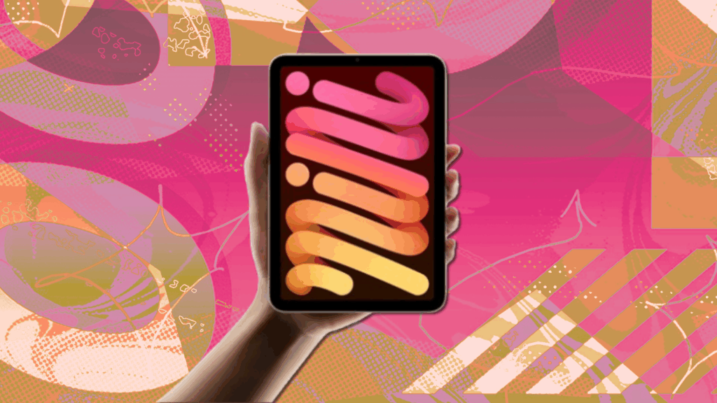 hand holding Apple iPad Mini with colorful abstract background