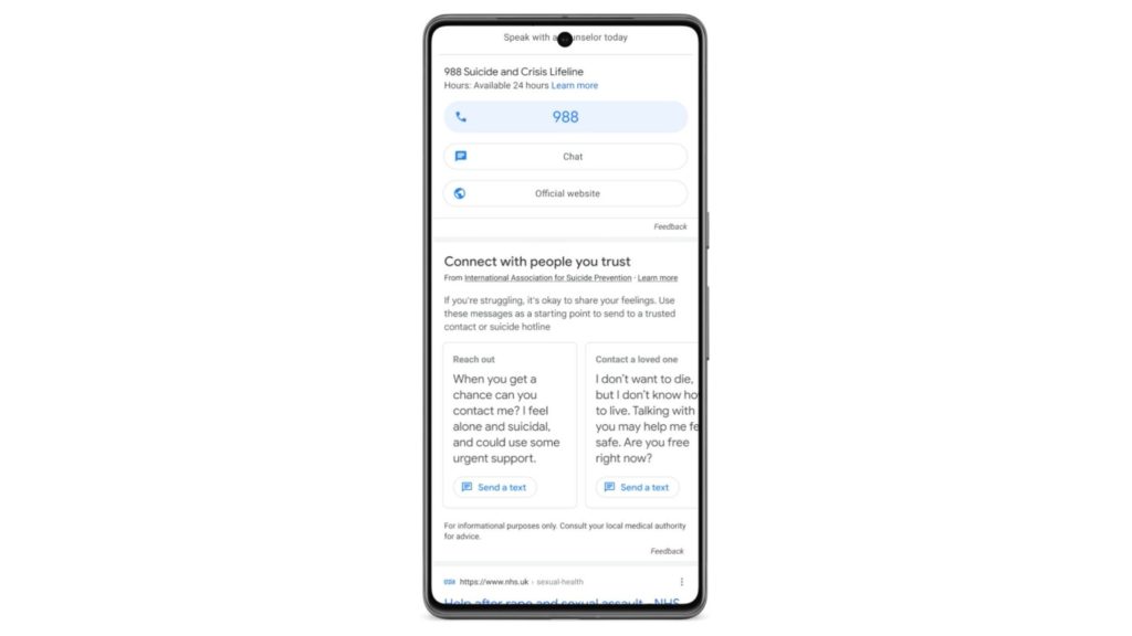 The pre-written messages will appear below the 988 Suicide and Crisis Lifeline, which Google has displayed at the top of suicide-related searches in the U.S. since last year. Users will be able to swipe through several message options on their phone, then tap a “Send a text” prompt to open their messaging app and paste it in.
