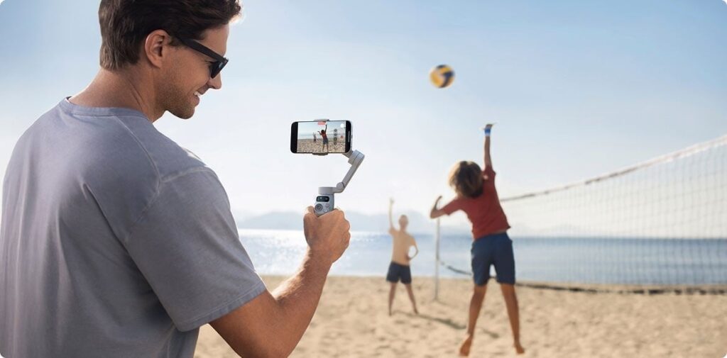 a person holds up the DJI Osmo Mobile 7 to film people playing volleyball on a sunny beach