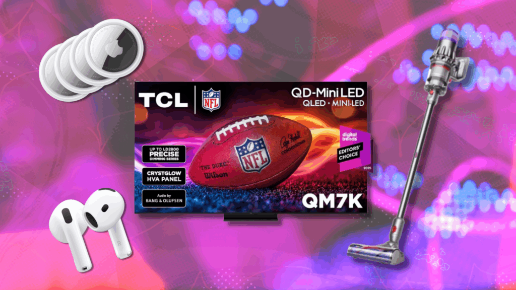 Apple AirTags, AirPods, TCL TV, and Dyson vacuum with pink background